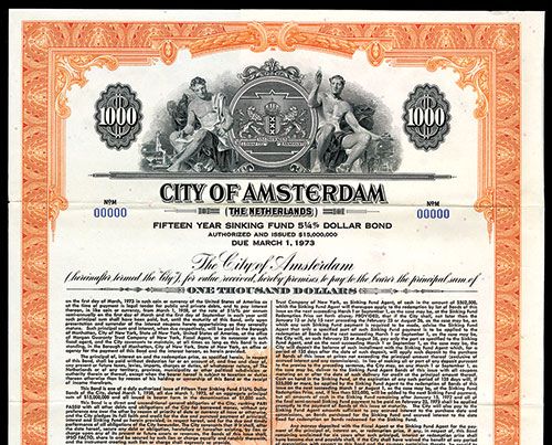 Amsterdam, 1958, $1000, 15 Year Sinking Fund 5 1/4% Dollar Specimen Bond, Vertical format, Coupons attached, POC's, VF condition, ABNC.