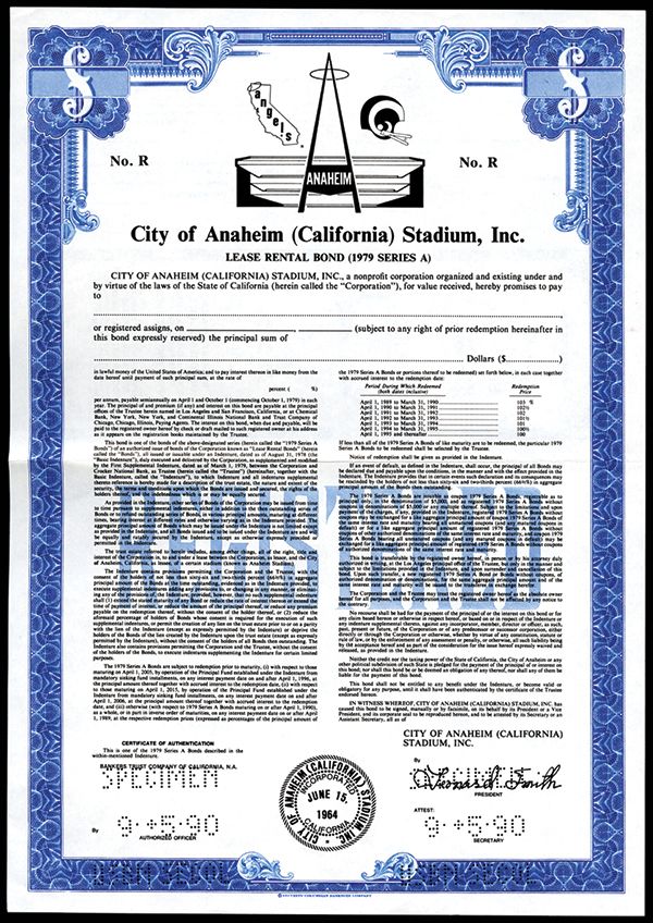 City of Anaheim (California) Stadium, Inc. 1979 Specimen Bond. Anaheim, California. $-Odd, Specimen "Lease Rental Bond (1979 Series A)" bond. Red border. Red specimen overprints. Vignette of "Angels" baseball and "Rams" football logos. Rare sports related bond from famous Southern California teams and stadium located next to Disney Land. XF condition. Jeffries BNC. Only 3 found in Archives 12 years ago.
