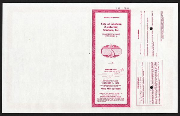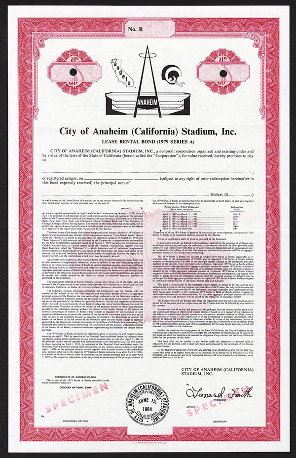 Anaheim, California. $-Odd, Specimen "Lease Rental Bond (1979 Series A)" bond. Red border. Red specimen overprints. Vignette of "Angels" baseball and "Rams" football logos. Rare sports related bond from famous Southern California teams and stadium located next to Disney Land. XF condition. Jeffries BNC. Only 3 found in Archives 12 years ago.