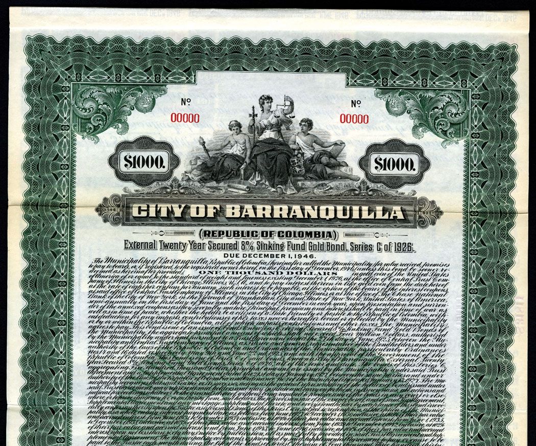 Colombia, lot of 2 bonds, Both City of Barranquilla External 20 year Secured 8% Sinking Fund Gold Specimen Bonds, Includes $1000, 1926 and $100, 1925 Vertical format bonds, Coupons attached, POC's, Fine-VF condition with some splitting at the folds on the $100 bond. , FLD-ABNC.