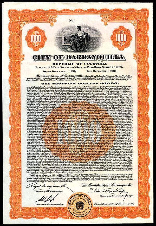 City of Barranquilla, 1939 Archival Specimen Bond. Colombia, 1939, $1000, 4% 25 Year Secured Sinking Fund Bond, Specimen bond that is Uncancelled and unmarked though it is from the archives, Black on orange border and underprint, Allegorical woman sitting top center with globe, Coupons attached, XF condition, Columbian BNC.