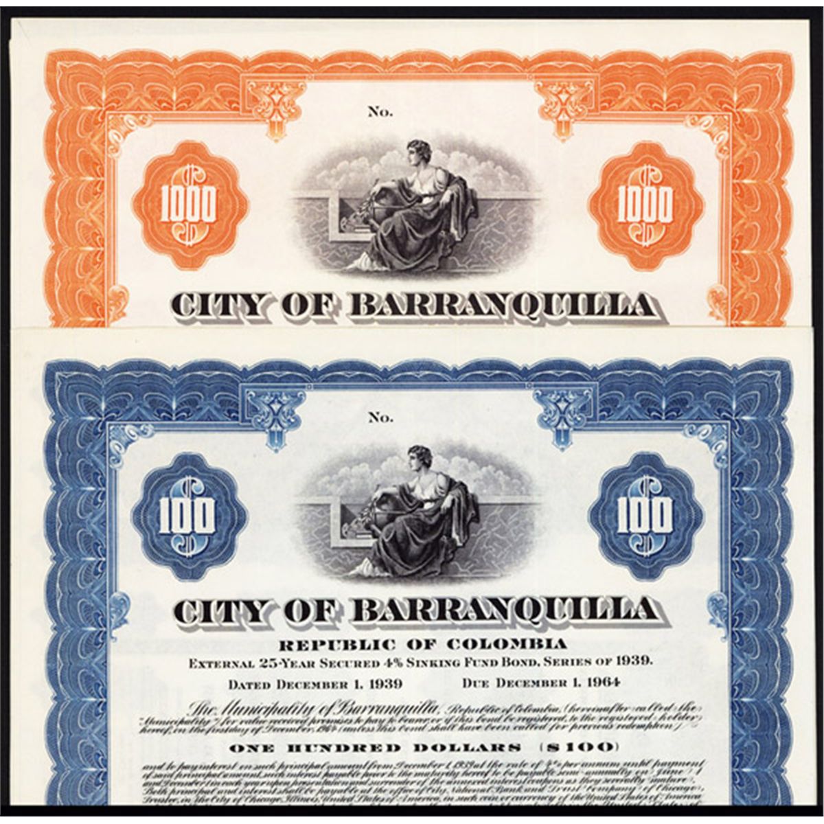 Barranquilla, Colombia, 1939, Lot of 2 unmarked Specimen Bonds, Includes $100 and $1000 Bonds, Blue and Orange, seated allegorical woman, arms at bottom, Coupons attached. All in XF and scarce. Columbian BNC.