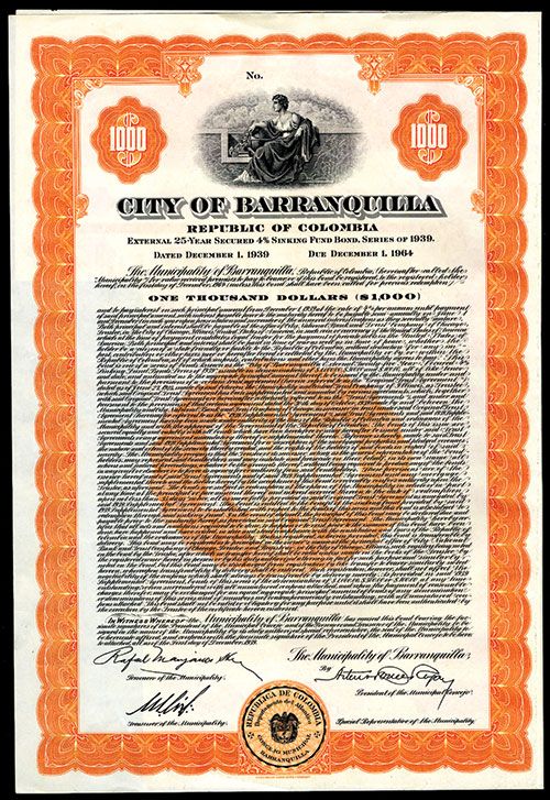 Colombia, 1939, $1000, 4% 25 Year Secured Sinking Fund Bond, Issued and Uncancelled, Black on orange border and underprint, Allegorical woman sitting top center with globe, Coupons attached with 10 of 60 cut out, VF condition, Columbian BNC.