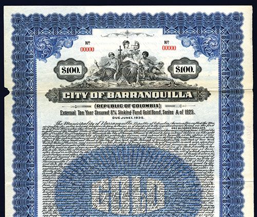Colombia, 1925, $100, Series A External 10 Year Secured 8% Sinking Fund Gold Issued and Cancelled Bond, Black on blue border and underprint, Three allegorical figures top center, POC's and red SPECIMEN overprint, VF condition, FLABNC.