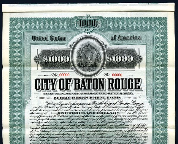 Louisiana. 1905. $1000 4% Specimen Bond. Black print with green border and underprint. State seal top center. POC's and red SPECIMEN overprint. VF-XF condition. ABNC.