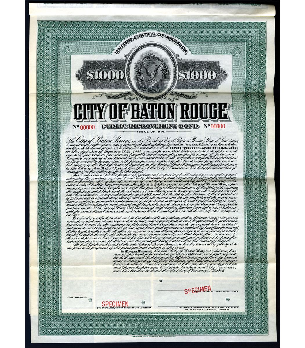 Baton Rouge, Louisiana. 1914. $1000 4 1/2% Public Improvement Specimen Bond. Green border and underprint. State arms top center. POC's and red SPECIMEN overprint. VF-XF condition. ABNC.