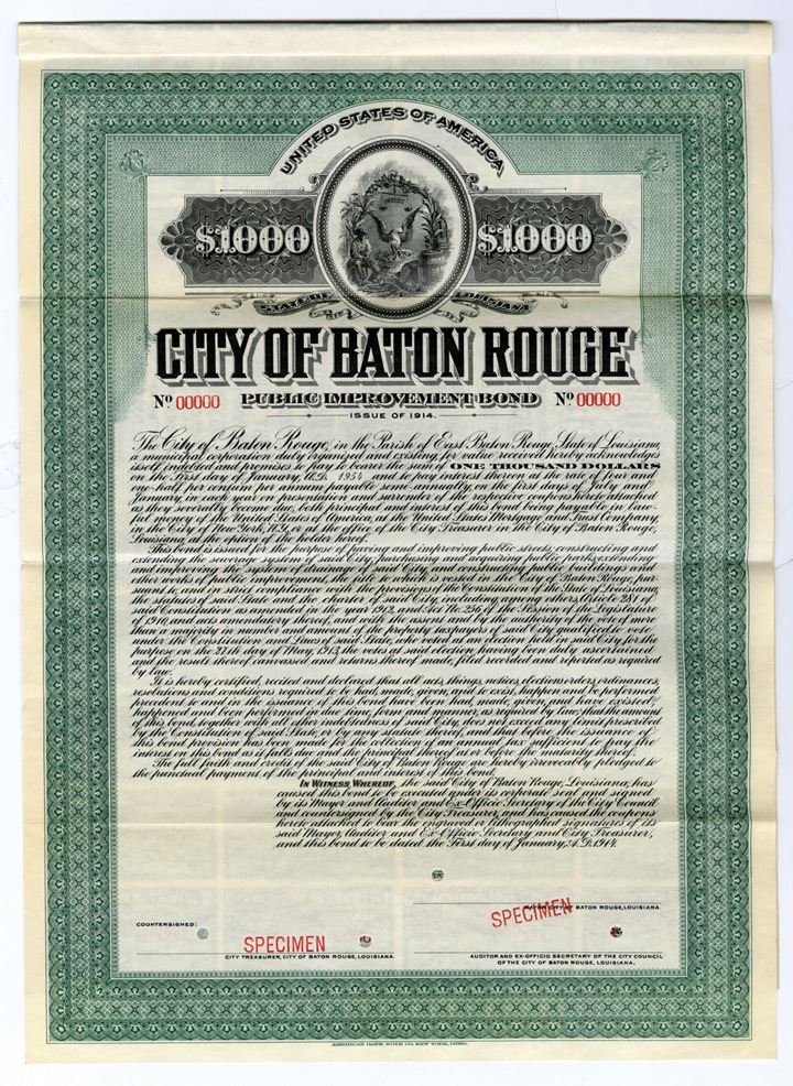 Baton Rouge, Louisiana. 1914, $1000 Specimen 4 1/2% Public Improvement Coupon Bond, Black print on green border and under tint, Seal of Louisiana at top, Specimen overprints and POC's, VF-XF condition, ABNC. Only 3 examples found in 2002 in the ABN Archives.