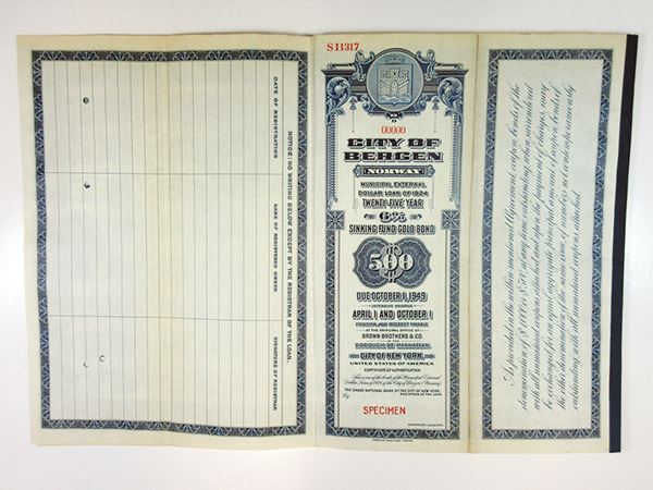 Norway. $500 Specimen 6% Municipal External Dollar Loan Sinking Fund Gold Coupon Bond, Allegorical woman at top, Black print on blue border and under tint, Specimen overprints and POC's, VF-XF condition, ABNC.