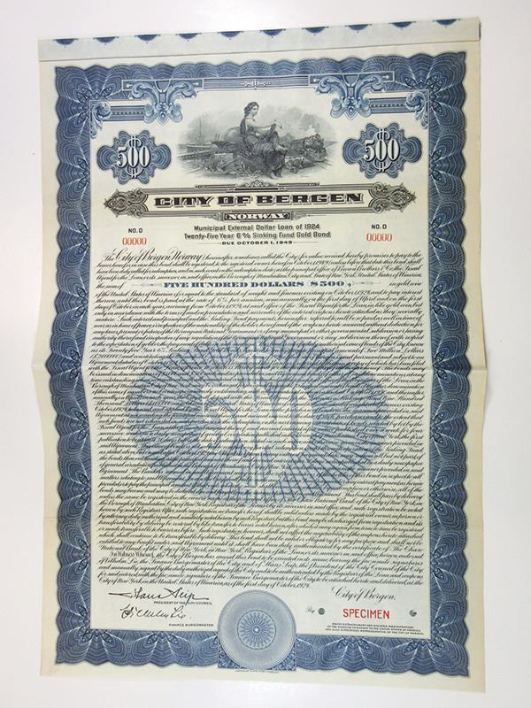 Norway. $500 Specimen 6% Municipal External Dollar Loan Sinking Fund Gold Coupon Bond, Allegorical woman at top, Black print on blue border and under tint, Specimen overprints and POC's, VF-XF condition, ABNC.