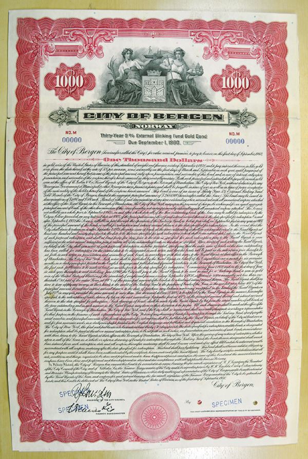 Norway. $1000 Gold Coupon Bond Specimen. ABNC. Coupon page at side. Very Fine.