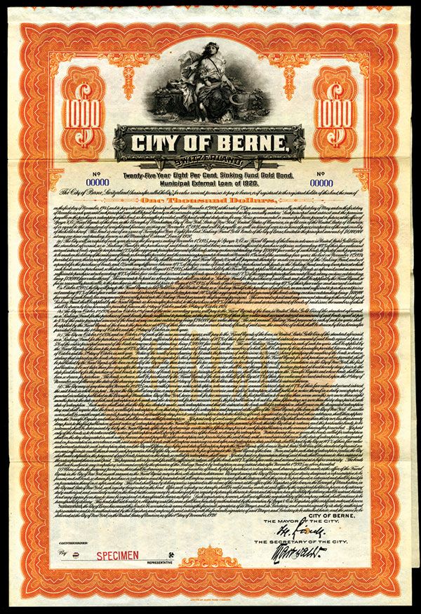 Berne, Switzerland, November 1, 1920, $1000. Municipal External Loan of 1920 - 8%. 25 Year Sinking Fund Gold Bond. Allegorical reaper with child seated, Facsimile signature of the Mayor of Berne. Orange border and undertint. Red specimen overprints, "00000" serial numbers and POC's. XF condition. Coupons attached. ABNC. Rare Swiss bond with only 2 found in archives.