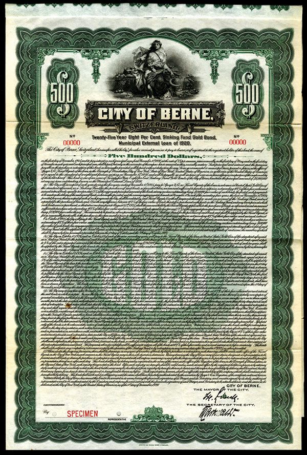 Berne, Switzerland, November 1, 1920, $500. Municipal External Loan of 1920 - 8%. 25 Year Sinking Fund Gold Bond. Allegorical reaper with child seated, Facsimile signature of the Mayor of Berne. Green border and undertint. Red specimen overprints, "00000" serial numbers and POC's. VF condition with splits on top horizontal margins. Coupons attached. ABNC. Rare Swiss bond with only 2 found in archives.