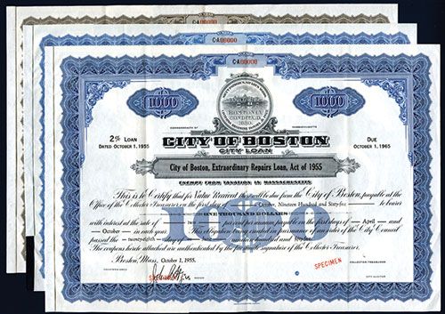Massachusetts, 1949, Lot of 3 items, includes 1955, $1000, 2% Extraordinary Repairs Loan Specimen Bond; 1949, $1000, 4% Municipal Relief Loan Specimen Bond; and, 1949, $1000, 1 1/4% Transit Assessment Loan Specimen Bond, all with POC's and red SPECIMEN overprints, VF condition, ABNC. Also includes Production folder with correspondence regarding the details of the bond construction.