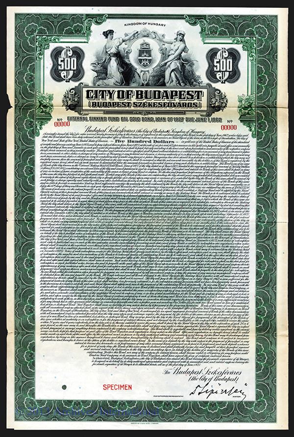 Hungary, 1927. $500. External Sinking Fund 6% Gold Bond, Loan of 1927. Green border and undertint. Allegorical women flank Arms of Budapest. Coupons attached. Red specimen overprints, "00000" serial numbers and POC's. Fine condition with small chip out of left margin. ABNC. Rare specimen bond.