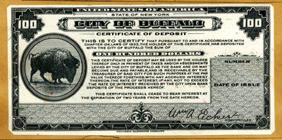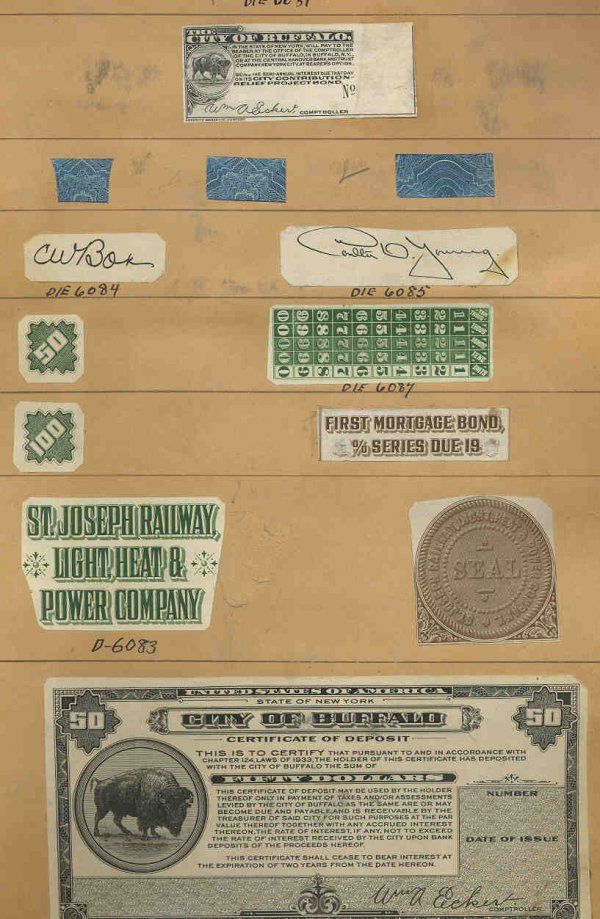 Buffalo, NY. 1933. $50; $100 2 different proofs mounted on sample book page. One side has a $50 scrip note on the bottom with other proofs from unrelated topics. The second side has a $50 and $100 back above a $100 face. The notes have a Buffalo on the left of the face and the middle of the back. Scarce Depression scrip notes. Both are AU-Unc. SBNC.