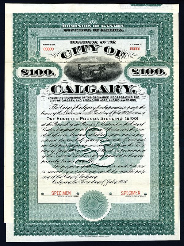 City of Calgary, 1908 Specimen 4 1/2% Bond. Calgary, Alberta, Canada, 1908, 100 lbs Sterling, Specimen Sterling Bond, Green Border with Farming Vignette, Coupons Attached, POC, XF. ABNC, Ottawa.