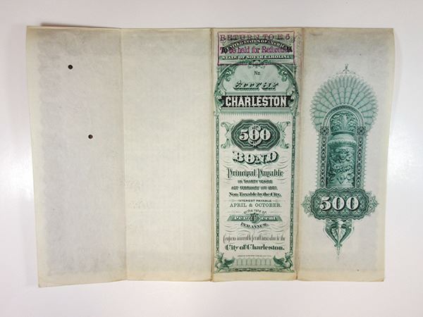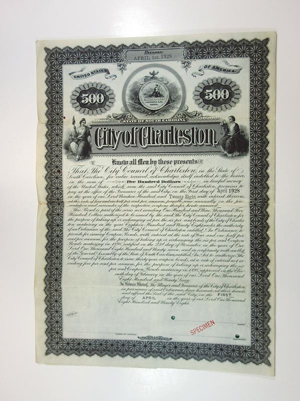 South Carolina. $500 Specimen 4 1/2% Coupon Bond, Allegorical figures at top flanking company title, Black print on black border, Specimen overprints and POC's, Fine condition with splitting along fold lines, ABNC.