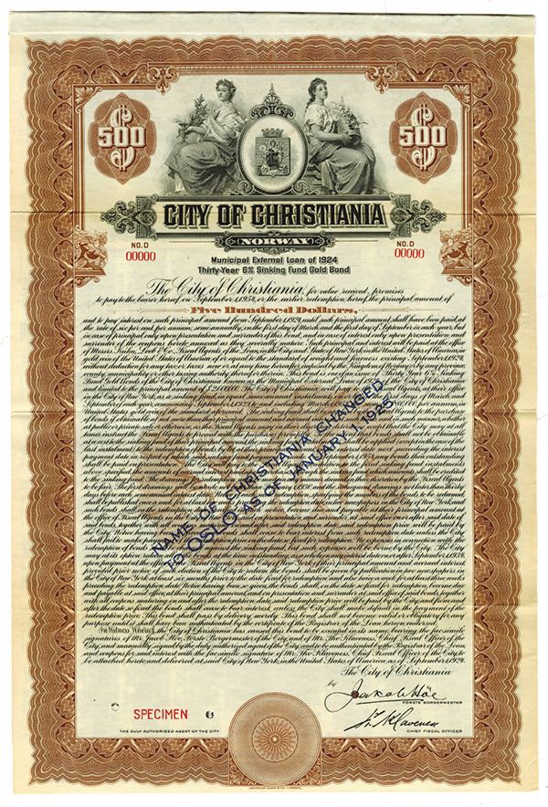 Norway. $500 Specimen 6% Municipal Sinking Fund Gold Coupon Bond, Black print on brown border and under tint, Allegorical women at top flanking seal of Norway, Specimen overprints and POC's at bottom, Stamp across bottom stating "Name of Christiania changed to Oslo as of January 1925", VF-XF condition, ABNC.