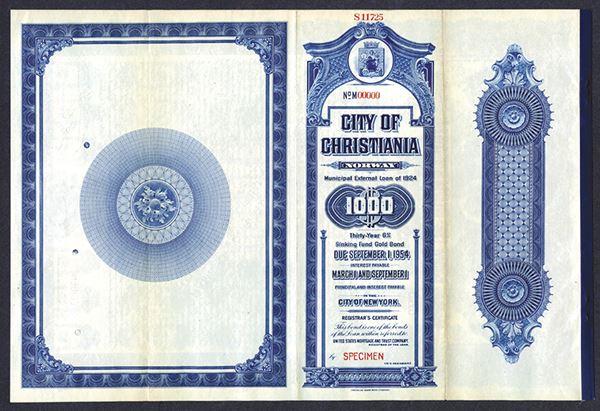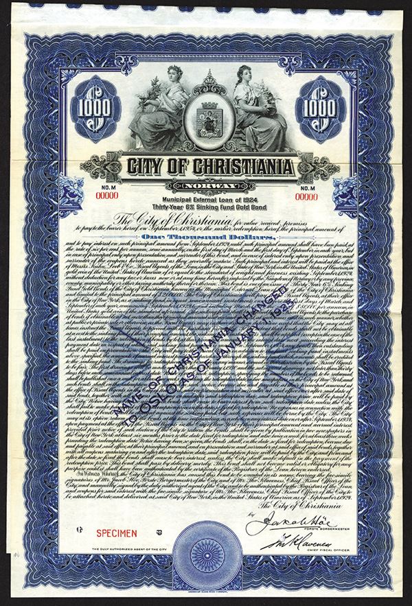 Norway. Specimen. Overprinted in blue "Name of Christiania Changed to OSLO as of January 1, 1925". (Bond dated 1924). $1000 Municipal External Loan of 1924 - 30 year 6% Gold Bond. Blue border and undertint. Allegorical women flank Arms of Christiania. Red SPECIMEN overprint and POC. Coupons attached. XF Condition. ABNC. Rare and historic transition bond from Norway.