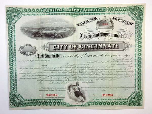 Cincinnati, Hamilton County, Ohio. $-Odd Amount Specimen 5% Coupon Bond, Black print on ornate green border and under tint on horizontal format, Arial view of city of Cincinnati at top, allegorical woman at bottom. Horizontal bond, Specimen overprints and POC's, VF-XF condition, CBNC.