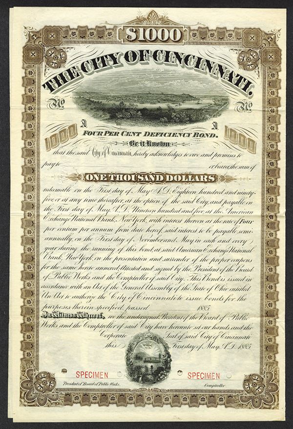 Ohio. $1000 4% Coupon Bond Specimen. ABNC. POCs. VF+