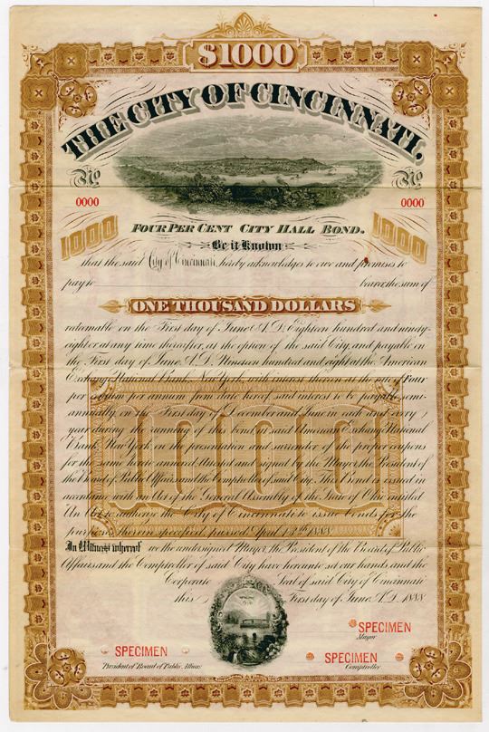 Ohio, 1888. $1000 Specimen 4% City Hall Coupon Bond, Black text with brown border and undertint, Birds-eye-view of Cincinnati at top center. Red specimen overprints, 0000 serial numbers, and POCs. Fine condition, ABNC.