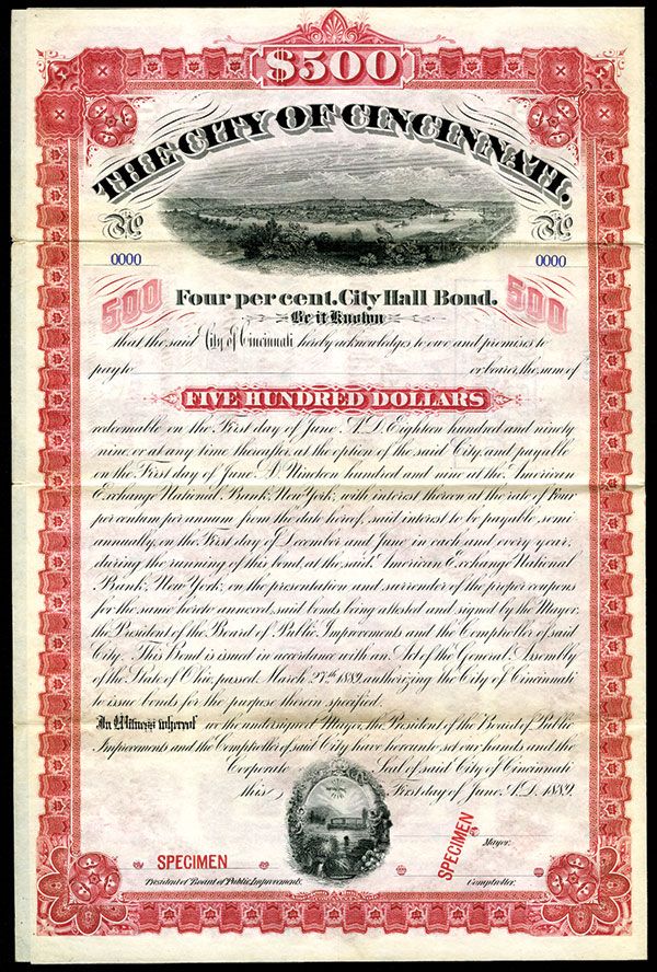 Ohio. 1889. $500 4% Specimen Bond. Black print with pink border and underprint. Panoramic view of Cincinnati top center. POC's and red SPECIMEN overprints. VF condition. ABNC.