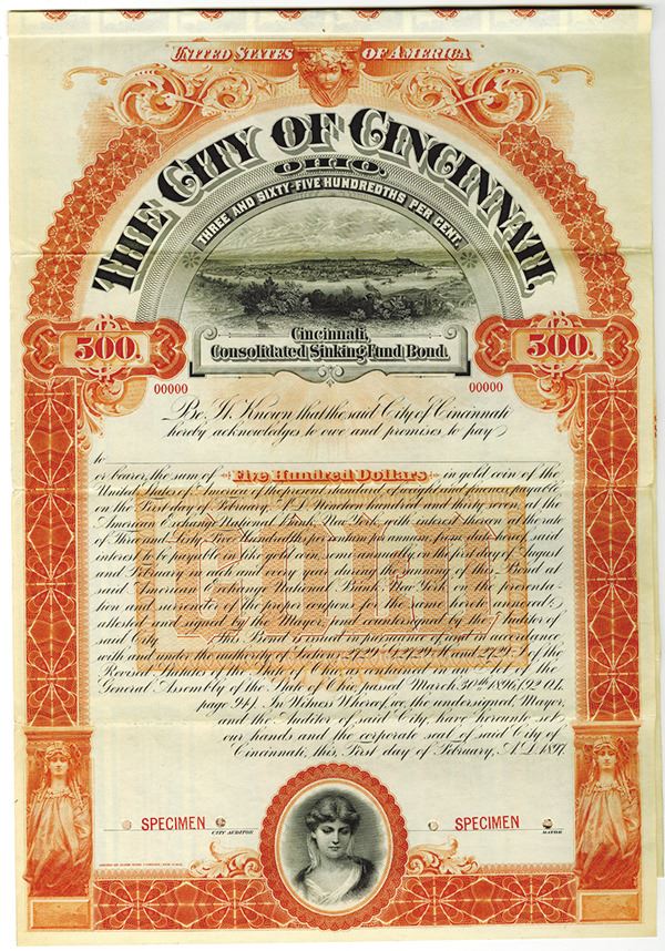 Ohio, 1897. $500 Specimen 3 65/100% Consolidated Sinking Fund Coupon Bond, Black text with ornate orange border and undertint, Birds-eye view of Cincinnati depicted at top center. Red specimen overprints, 00000 serial numbers, POCs. Fine condition, ABNC.