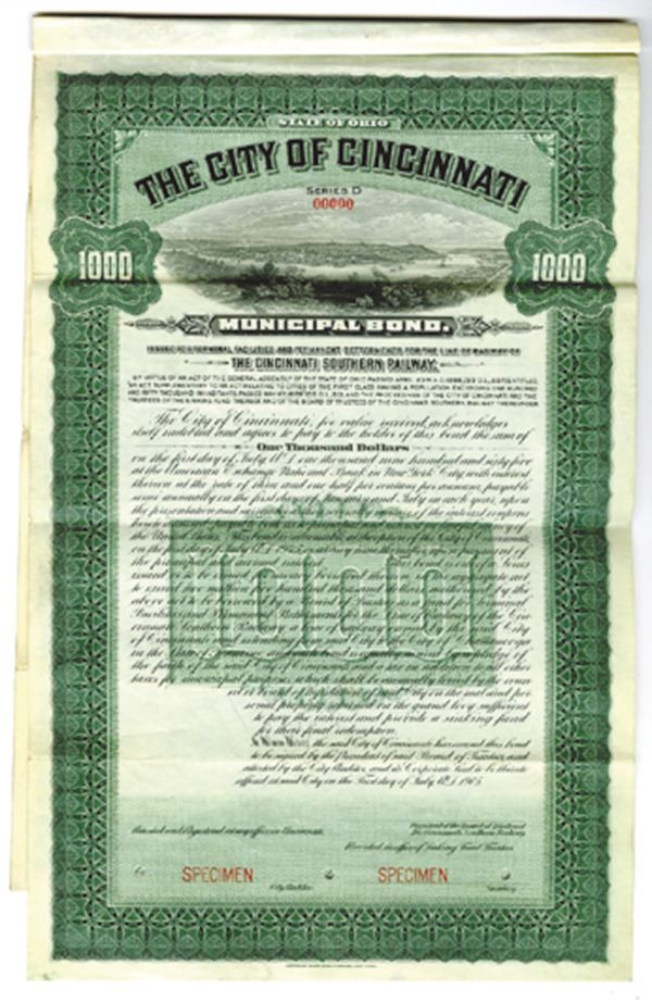 Cincinnati, Ohio. $1,000 Specimen 3 1/2% Specimen Bond "issued for terminal facilities and permanent betterments for the line of railway of Cincinnati Southern Railway" Black print on green border and under tint, Arial view of Cincinnati at top, Specimen overprints and POC's, VF-XF condition, ABNC.