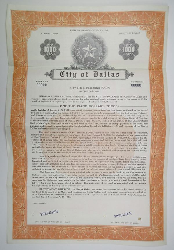Dallas, Texas. $1000 Specimen 2.50% City Hall Building Bond, Series No. 319. Black on orange, Texas arms at top center. XF ABNC.