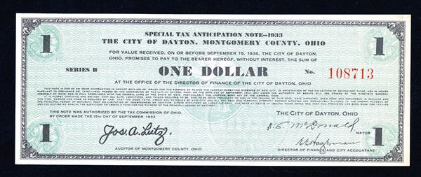 Dayton, Ohio. $1, Issued, Black with blue underprint, "Special Tax Anticipation Note - 1933". Uncirculated.
