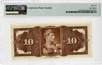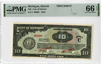 Detroit, Michigan, 1934. $10 Specimen Depression Scrip, Dark green or black on olive and multicolor underprint, Detroit Arms at left, classical allegorical figure holding hammer on back printed in brown, S/N C 00000, PMG graded Gem Uncirculated 66 EPQ. ABNC.