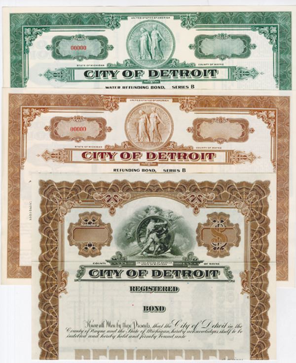 Detroit, Michigan. Trio of Specimen Detroit Bonds. 1) $-Odd Registered Odd% Specimen Bond, Black print on brown border and under tint, Allegorical male at top with large wheel. 2) $-Odd Specimen Odd% Series B Refunding Bond, Black print on brown border and under tint on horizontal format, Seal of Detroit at top. 3) $-Odd Specimen Odd% Series B Water Refunding Bond, Black print on green border and under tint on horizontal format, Seal of Detroit at top. All bonds have Specimen overprints and POC's, and are in VF-XF condition, ABNC. 3 Pieces.