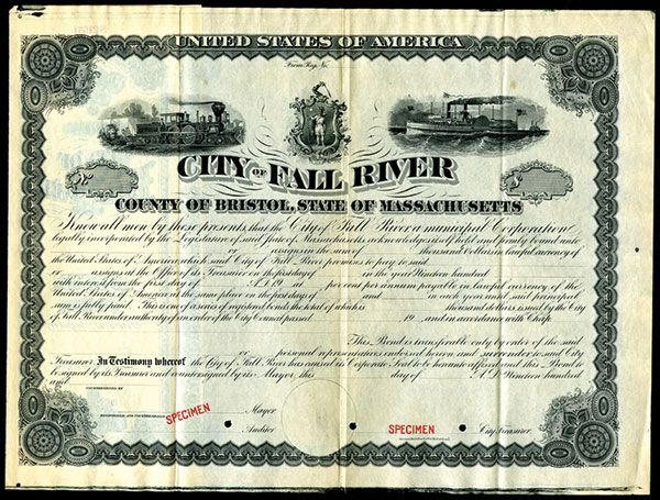 Massachusetts. 190x. $- Specimen Bond. Black print with ornate black border and black underprint. State seal flanked by locomotive and steamship top center. POC's and red SPECIMEN overprints. VF condition. ABNC.