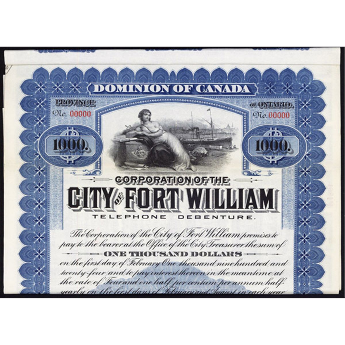 City of Fort William, Canada, 1909, $1000, Telephone Debenture, Blue border and underprint, Allegorical woman with steamship at dock, coupons attached. XF condition. ABNC.