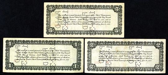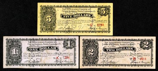 Gastonia, North Carolina. Lot of 3 depression scrip notes, Includes 1, 2, and 5 Dollar denominations. All are perforated "PAID". Fine to Very Fine. 3 pieces.