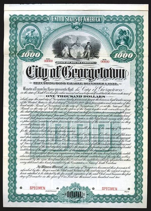 Georgetown, SC. $1000, 4 1/2% Coupon Bond, Black on green border, Slave picking cotton and holding child on upper corners, Arms of South Carolina in middle, VF, ABNC.