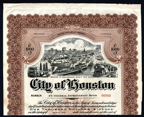 Texas, 1959, $1000, 4% General Improvement Specimen Bond, Vignette top center of Houston, POC's red SPECIMEN overprint and red s/n “ 00000” , VF condition, WBNC.