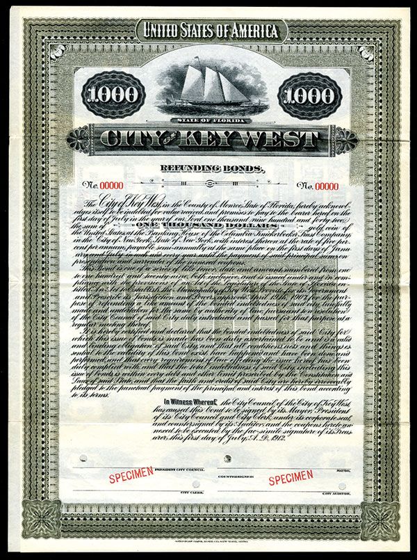 Florida. 1912. $1000 5% Specimen Bond. Black print on olive border and underprint. Schooner top center. POC's and red SPECIMEN overprints. VF-XF condition. ABNC.