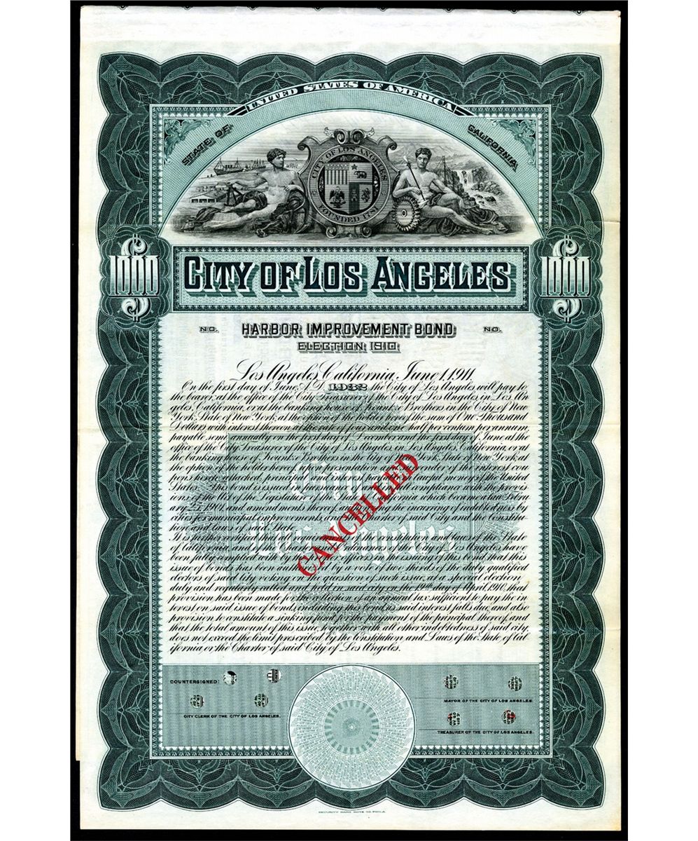 California. 1910. $1000 4 1/2% Specimen Bond. Black on green border and underprint. Allegorical males flank Los Angeles arms top center. POC's. VF condition. SBNC.