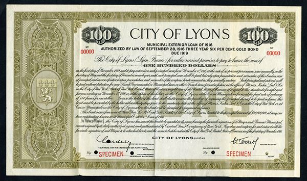 Lyons, France. $100 Specimen 6% Municipal Exterior Gold Coupon Bond, Black print on olive green border and under tint, Company title at top with large ornate design at left side, Specimen overprints and POC's, VF-XF condition, ABNC.