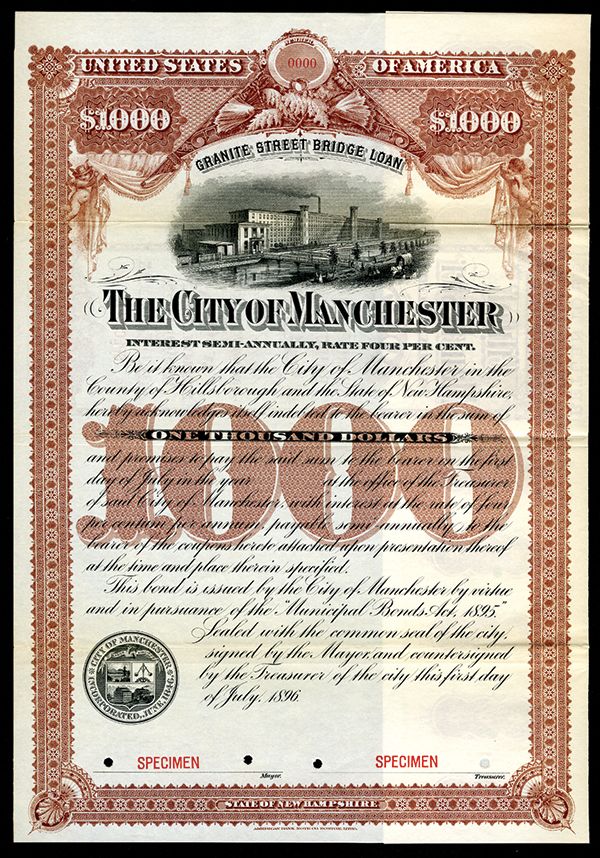City of Manchester, Granite Street Bridge Loan, 1896 Specimen Bond. Manchester, New Hampshire. $1000 4% Coupon Bond, Black on brown-red border, bridge in front of large building, VF, ABNC.