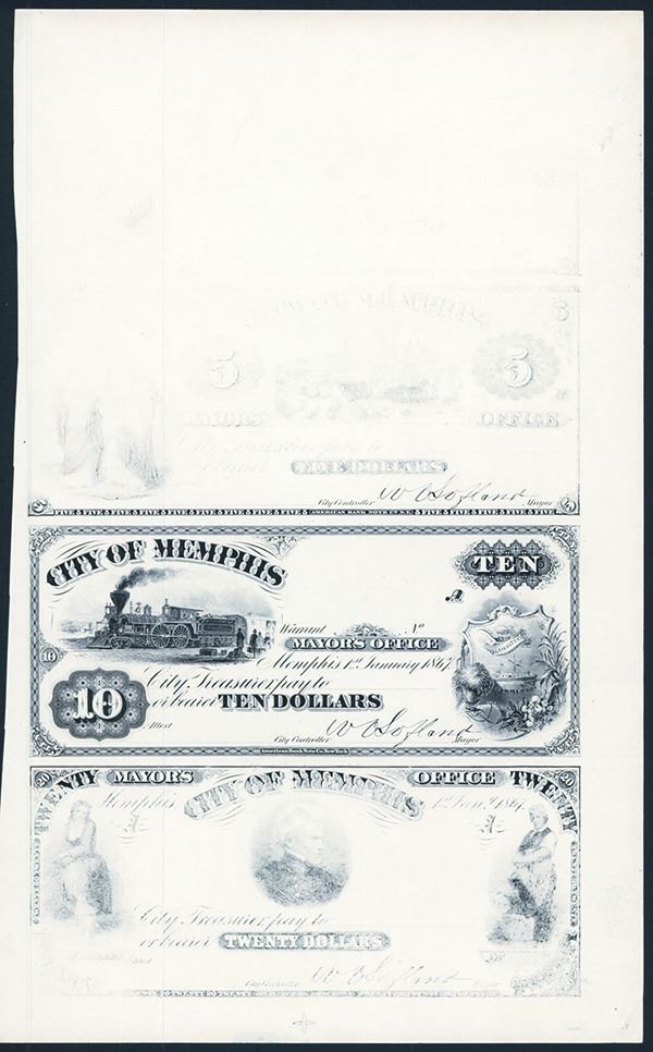 Memphis, Tennessee. Lot of 4 notes (uncut sheet of 4) of full black printing on the $10 note and partial lighter printing of the $20, the $5 notes are ghost printing, all without underprint, Originally printed in 1866-67 (ca.1960-70's), $5-5-10-20, (Haxby Unlisted), Modern "Proprietary Proofs". The $10 note has locomotive at station on top left with Tennessee arms on lower right; The $20 note has portrait of military man in uniform flanked by allegorical female holding sheaves on left and blacksmith on right, Black printing without underprint printed on off white thick paper of border, text, title and vignette, The fully printed $10 note would grade Choice to Gem Uncirculated if cut from sheet. ABNC. Archival "Proprietary" proofs rarely seen in sheet form. (ABN Commemoratives, AIA XI, May 15, 2012)