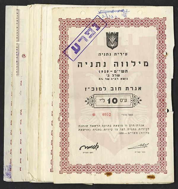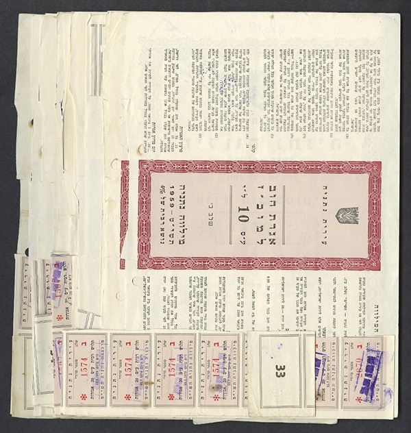 Israel. 10 Lira Coupon Bonds. Handstamped Cancelled. Many with coupons attached, staple rust. VF+. 16 pieces.