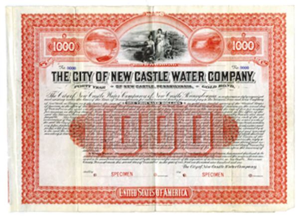 Pennsylvania. $1000 Specimen 5% Gold Coupon Bond, Black print on red/orange border and under tint in horizontal format, Allegorical women together at top, Specimen overprints and POC's, Fine-VF condition, ABNC.
