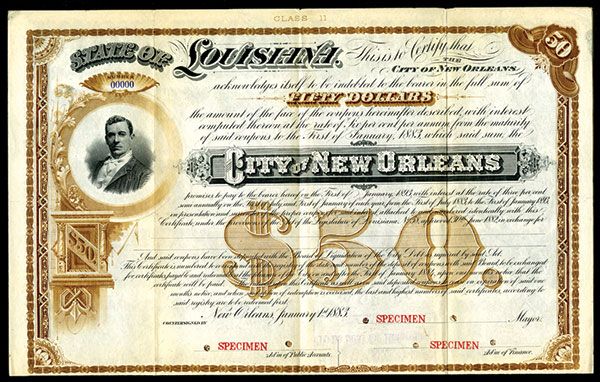 Louisiana. 1883. $50 6% Specimen Bond with coupons attached. Black print with brown border and underprint. Vignette of gentleman on the left. POC's and red SPECIMEN overprints. VF condition. ABNC. Unique in archive.