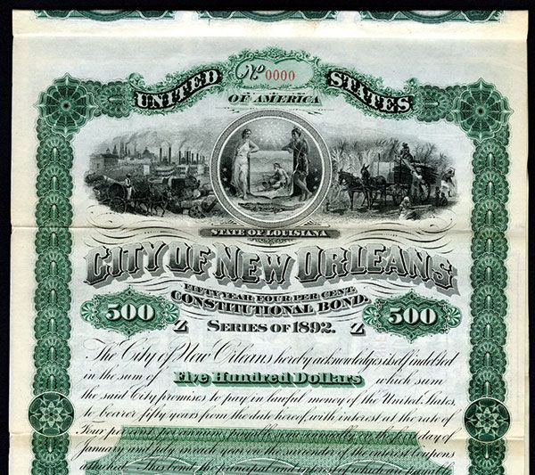 Louisiana. 1892. $500 Specimen Bond with coupons attached. Black print with green border and underprint. State Seal top center flanked by scenes of the South. POC's and red SPECIMEN overprints. VF condition ABNC.