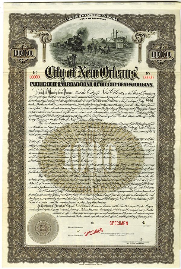 Louisiana, 1909. $1000 Specimen 5% Public Belt Railroad Coupon Bond, Black text with brown border and undertint, Men at work on train tracks at top center. Red specimen overprints, 00000 serial numbers, POCs. Fine condition, ABNC.