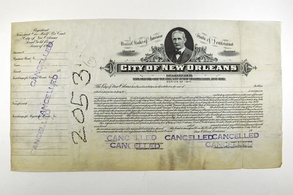 Louisiana. Black plate proof, plate # in crayon 2053 and hand stamped cancelled. The file copy upon plate destruction. Male portrait at top, with counterfoil at left. Paper separation at fold, edge tear not affecting design area. As made, dirty. The only one found in the archives.