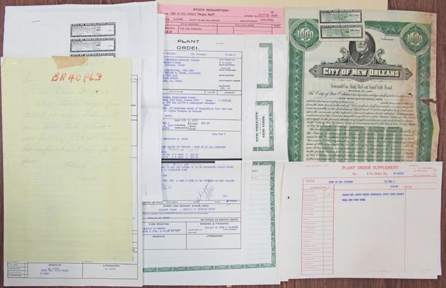 New Orleans, Louisiana, 1927-1970. City of New Orleans, $1,000 Unissued Bond. Black with green border. Also included is large folder with plant order and art work mock up from Security Banknote Co. Very interesting lot. Sold "AS IS" no returns accepted.